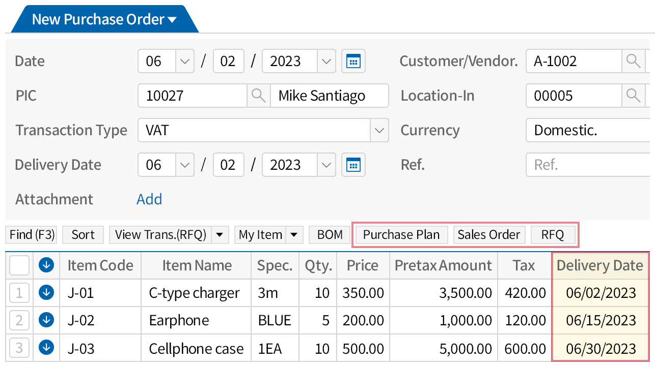 purchase plan, sales order, and RFQ,